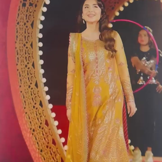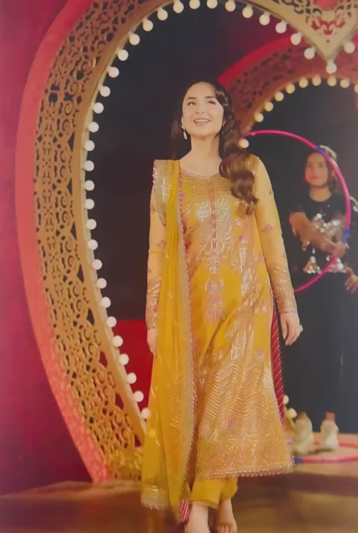 Subtle yet undeniably festive, this ensemble is a quiet celebration of traditional charm. The shirt is a vision of visual eloquence, brought to life with intricate embroidery in antique gold zari and shimmering cupped 5mm light gold sequins. Delicate magenta threadwork winds its way through the design, adding a whisper of color and depth to the golden tapestry. The look is completed with a lightly embroidered dupatta that adds an airy, graceful touch—balancing the richness of the shirt with effortless poise. A refined choice for those who embrace festivity with elegance.